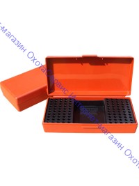 Кейс с крышкой и ручкой для безопасной переноски и хранения 250-ти патронов калибра 22 LR или 150-ти патронов калибра 17 HMR​. Материал - красный пластик.
