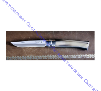 Нож Opinel Atelier Collection №08 – Эта серия была задумана и изготовлена сотрудниками мастерских Opinel (отсюда и её название), желающих показать на что они способны. У них была идея объединить в рукояти чёрное дерево и древесину грецкого ореха. Оригинальная система фиксации открытого лезвия Virobloc. (Viroblock® - оригинальное запорное устройство, представляющее собой кольцо с прорезью, которое, будучи повернуто относительно оси ножа, упирается в пятку клинка и не дает ножу самопроизвольно складываться при работе или раскладываться в кармане. Конструкция эта защищена патентом и устанавливается на ножи Opinel с 1955 года, начиная с модели n°6.). Французская фирма Opinel - производитель ножей с 1890 года. При изготовлении ножей используются исключительно лучшие материалы и строго контролируется качество каждой выпускаемой единицы. Удачная конструкция ножей обеспечила фирме не только длительное существование, но и всемирную славу. Ножи Opinel являются символом Франции. Классический нож этого типа - рукоять из дерева, металлическая втулка, ось, клинок и поворотное кольцо. Такая простота наряду с малой ценой и отличным качеством - вот рецепт успеха этих ножей.